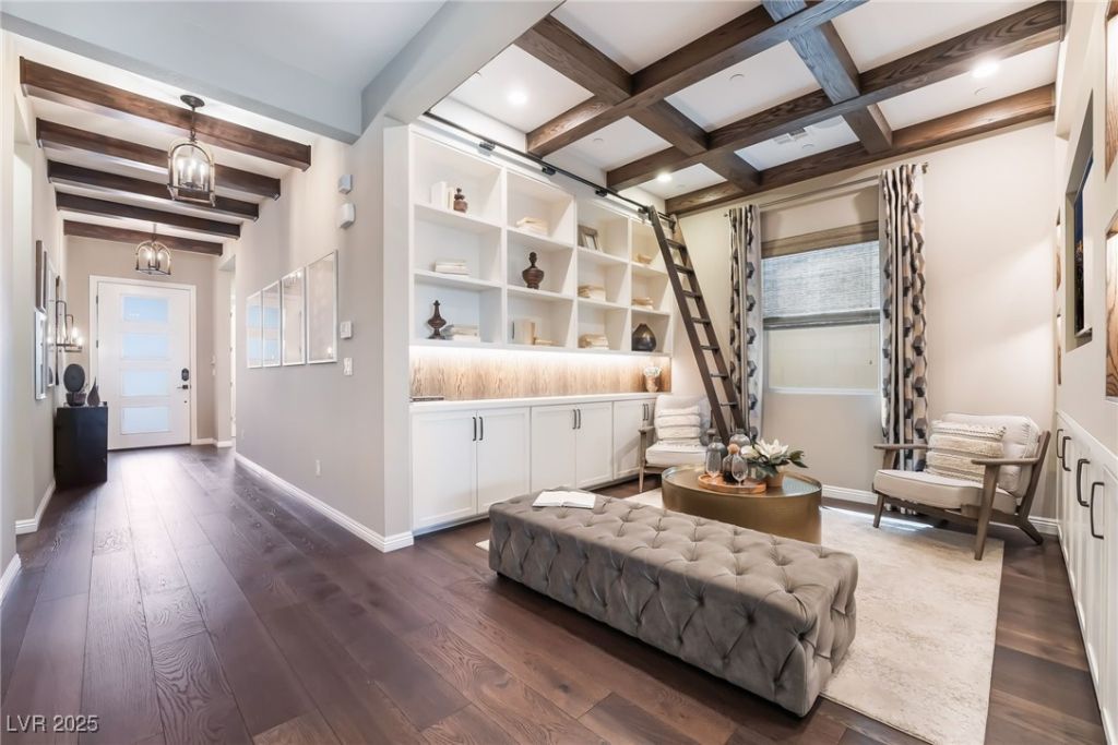Exquisitely upgraded, fully furnished and truly one of a kind, this former model home in the highly sought-after Cadence area showcases nearly $430,000 in builder upgrades. This single-story stunner offers 2,331 sq ft of open-concept living, 3 bedrooms, a private library with warmly backlit shelves, and 3-car garage with epoxy floors. The great room flows seamlessly into the backyard oasis through a 12' sliding glass door?perfect for indoor-outdoor living. Highlights include real oak flooring, exposed ceiling beams, a dramatic backlit wine wall, and a master suite with private patio access and a elegantly detailed custom wood-paneled ceiling. The spa-like primary bath and walk-in closet continue the refined wood theme. Enjoy peaceful evenings by your private pool, with the soothing sounds of a cascading water feature. This home is a rare masterpiece?crafted with intention, elegance, and detail unmatched in the area. Do not wait to schedule to your private tour.